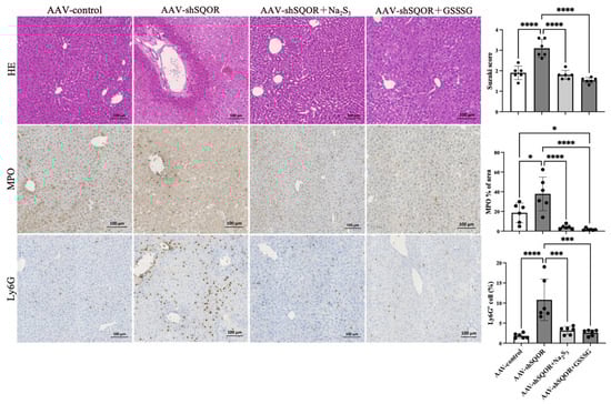 Hepatic histological changes in AAV-control, AAV-shSQOR, AAV-shSQOR+Na2S3, and AAV-shSQOR+GSSSG mice. Representative images of hematoxylin and eosin staining and immunohistochemical expression of myeloperoxidase (MPO) and lymphocyte antigen 6G (Ly6G) 4 h after reperfusion in mice from each group. The right panels show the differences in Suzuki score, MPO immunoreactivity levels, and Ly6G immunoreactivity levels in the mice of each group. The data are presented as n = 6 per group. Significant differences between groups were determined using one-way analysis of variance. Data are expressed as the means ± standard deviations, * p < 0.05, *** p < 0.001, and **** p < 0.0001.