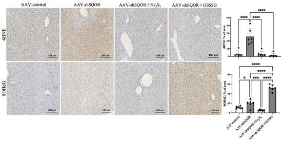 Hepatic histological changes in AAV-control, AAV-shSQOR, AAV-shSQOR+Na2S3, and AAV-shSQOR+GSSSG mice. Representative images of the immunohistochemical expression of 4-hydroxy-2-nonenal (4HNE) and 8-hydroxy-2-deoxyguanosine (8OHdG) 4 h after reperfusion in mice from each group. The right panels show differences in 4HNE and 8OHdG immunoreactivity levels in mice of each group. The data are presented as n = 6 per group. Significant differences between groups were determined using one-way analysis of variance. Data are expressed as the means ± standard deviations, * p < 0.05, *** p < 0.001, and **** p < 0.0001.