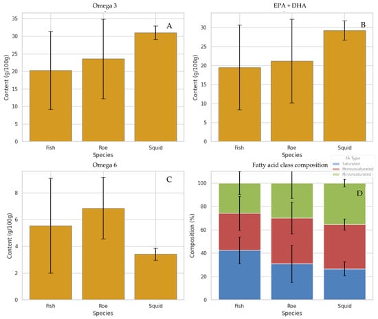 Average fatty acid composition across the marine species analyzed, presented as Mean ± Standard Deviation. “Fish” refers to the group of fish by-product samples listed in the ESM (Table S1), “Roe” corresponds specifically to grey mullet roe samples, and “Squid” refers to squid by-product samples (bellies). Values represent the mean of all samples within each species group. (A) Total omega-3 content (%), (B) sum of EPA and DHA (%), (C) total omega-6 (%), and (D) fatty acid class composition (%).