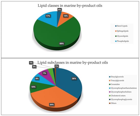 (Up): Pie chart showing the lipid classes presented in marine by-product oils. (Bottom): Pie chart showing the lipid subclasses presented in marine by-product oils.