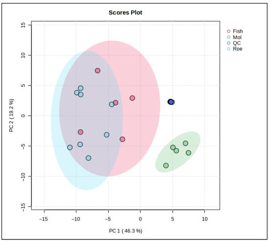 These distinct clusters underscore the unique lipidomic signatures associated with each sample origin. The separation along PC1 indicates that squid lipid profiles markedly differ from fish and roe, potentially due to their unique triglyceride and fatty acid composition. Meanwhile, the positioning of squid along PC2 suggests that its lipid profile possesses specific attributes that differ from fish and roe, possibly related to structural lipids unique to its biological function.