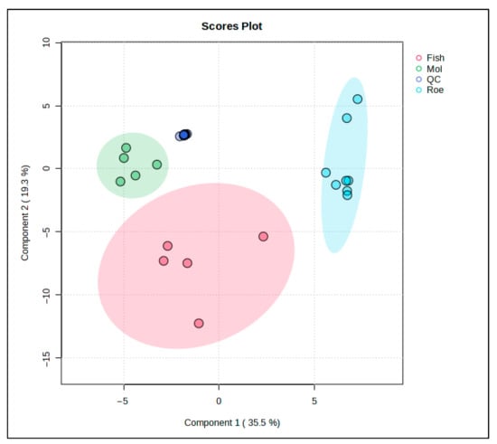 PLS-DA was used to further study the lipid profiles of the samples. This PLS-DA scores plot (Figure 4) shows the distribution of fish, squid, roe, and QC samples, revealing distinct lipidomic patterns among these groups with the aid of supervised dimensionality reduction. Here, Component 1 explains 45.9% of the variance, while Component 3 accounts for 8.4%, collectively capturing over half of the variance in the lipid profiles within the dataset.