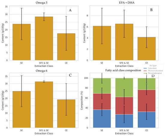 Fatty acid content in samples of marine oils based on the extraction technique used, presented as Mean ± Standard Deviation. Fatty acid composition was determined by GC-FID following transesterification of whole oil samples and is shown as extraction-class averages across the available samples. (A) total omega-3 content (%), (B) sum of EPA and DHA (%), (C) total omega-6 (%), and (D) fatty acid class composition (%).