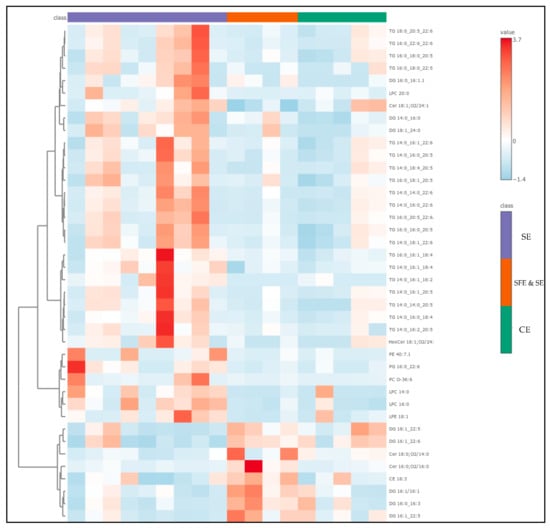 The compounds with the highest VIP scores—representing the most influential lipids in distinguishing between extraction classes—are listed in Table S3 of the ESM. From this group, the top 40 were used to generate the heatmap shown in Figure 8, highlighting the lipid species most responsible for the observed sample clustering. Interestingly, half of these key differentiators were TGs—complex storage lipids that often carry high-value omega-3 fatty acids such as EPA and DHA. These were most abundant in the SFE and SE extracts, reinforcing the idea that this technique is more effective at preserving intact, functional lipids. DGs accounted for another 20% of the VIPs and were more prevalent in TE and SE samples, where they likely resulted from partial hydrolysis or TG degradation [54,55,57]. Similarly, lysophosphatidylcholines (LPCs)—well-known markers of membrane damage and oxidative stress—were also more common in these conventional and solvent-based extracts. Only a few phosphatidylethanolamines (PEs) appeared among the VIPs, but those detected were DHA-rich and notably concentrated in SFE and SE samples.