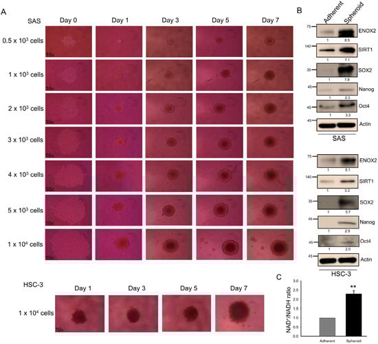 Sphere formation, the aggregation of cells into 3D structures under non-adherent conditions, is an in vitro method that is widely used to assess stem-like properties. Consistent with a previous report [59], both p53-functional SAS and p53-mutant HSC-3 oral cancer cell lines formed spheres at varying seeding densities in our system (Figure 5A). Compared with adherent monolayer cultures, spheroid cells exhibited elevated levels of expression of ENOX2, SIRT1, and the stemness-associated markers, SOX2, Nanog, and Oct4 (Figure 5B). Notably, both the protein level and enzymatic activity of ENOX2, as reflected by the NAD+/NADH ratio, were markedly higher in spheroids than in adherent cells (Figure 5B,C), supporting the idea that the spheroids were enriched with a stem-like subpopulation.