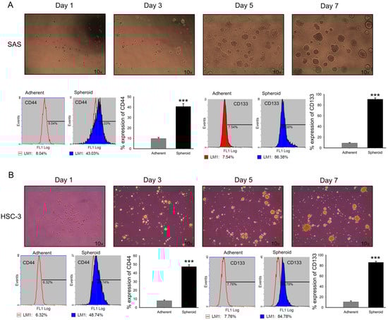 Expression of CD44 and CD138 in SAS and HSC-3 spheroid cells. (A,B) SAS and HSC-3 cells were cultured in poly-HEMA-coated 10 cm dishes under non-adherent conditions. After 7 days, spheroids were dissociated into single cells stained with FITC-conjugated antibodies against CD44 and CD138, and analyzed by flow cytometry. Percentages of positive cells were determined. Both markers were significantly increased in spheroid cultures compared with adherent controls. Data are presented as mean ± SD from at least three independent experiments (*** p < 0.001 vs. control).
