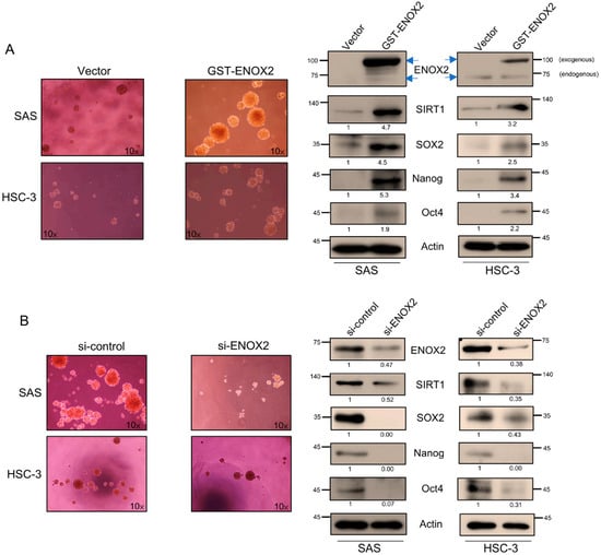 We observed that both ENOX2 and SIRT1 were upregulated in spheroid cultures, a system that selectively enriches for cancer stem-like cells. This suggests that their elevated expression is likely functionally associated with sustaining CSC properties, such as self-renewal and survival, rather than being a downstream byproduct of spheroid growth or the initiation of stemness traits. To further explore the role of ENOX2 in stem-like cancer cell populations, we transiently overexpressed ENOX2 in two oral cancer cell lines: SAS cells (p53-functional) and HSC-3 cells (p53-mutant). ENOX2 overexpression was found to significantly enhance sphere formation, a hallmark of CSC self-renewal (Figure 7A, left panel), and increased the expression of SIRT1 and stemness-associated markers, SOX2, Nanog, and Oct4 (Figure 7A, right panel). Conversely, RNAi-mediated knockdown of ENOX2 reduced sphere formation (Figure 7B, left panel) and downregulated SIRT1, SOX2, Nanog, and Oct4 (Figure 7B, right panel). These molecular changes were accompanied by signs of differentiation, supporting the hypothesis that ENOX2 is likely required for maintenance of stem-like traits. Collectively, our findings demonstrate that ENOX2 promotes CSC-like properties in oral cancer cells, at least in part through regulation of SIRT1 and stemness-associated transcription factors. However, loss of ENOX2 disrupts these pathways, potentially driving cells toward differentiation, highlighting ENOX2 as a potential therapeutic target in oral cancer.