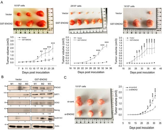 ENOX2 promotes the growth of oral cancer xenografts in ASID mice. (A) SAS cells were transiently transfected with GST or GST-ENOX2. After 72 h, cells were cultured in poly-HEMA–coated plates to form spheres. Following 7 days of sphere formation, spheroids were dissociated into single cells and subcutaneously inoculated into ASID mice at doses of 1 × 106, 2 × 104, or 1 × 104. Tumor growth was assessed by measuring tumor volume. Representative tumor morphology and quantitative analyses are shown. Statistically significant differences between the GST and GST-ENOX2 groups were determined by one-way ANOVA with LSD post hoc test (* p < 0.05, ** p < 0.01, *** p < 0.001). (B) Tumor tissues from both groups were homogenized and analyzed by Western blotting for stemness-associated markers. (C) Sphere-forming cells transfected with si-control or si-ENOX2 (1 × 106) were subcutaneously inoculated into ASID mice (n = 3 per group). Tumor growth, measured by assessment of tumor volume, was significantly reduced in the si-ENOX2 group compared with controls (* p < 0.05, *** p < 0.001).