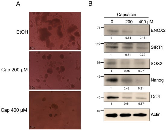 Having established that ENOX2 promotes oral cancer stemness and tumor growth both in vitro and in vivo, we next explored whether targeting this pathway could represent a therapeutic strategy. Capsaicin, a dietary bioactive compound from chili peppers, has been reported to exert anti-cancer effects, including inhibition of proliferation and induction of apoptosis through modulation of ENOX2 activity and related redox signaling [33]. Beyond oncology, capsaicin also influences stem cell behavior [61]. For example, it reportedly inhibits the differentiation of bone marrow stem cells (BMSCs) into adipocytes by inducing apoptosis, suppressing adipocyte-specific gene expression, and reducing BMSC proliferation [62]. In this study, we investigated whether capsaicin could affect oral cancer stem-like properties via interference with the ENOX2–associated pathways. Treatments with capsaicin (200 µM and 400 µM) significantly reduced sphere formation in SAS cells (Figure 9A). Western blot analysis further revealed that capsaicin suppressed the expression levels of ENOX2, SIRT1, and the stemness-associated markers, SOX2, Nanog, and Oct4 (Figure 9B). These results suggest that capsaicin may modulate the ENOX2-associated redox pathway, leading to altered NAD+-dependent SIRT1 signaling and a subsequent decrease in stemness-related transcriptional activity. We therefore propose a hypothetical model in which capsaicin indirectly influences the ENOX2–SIRT1–SOX2 regulatory network, resulting in attenuation of cancer stem-like properties. Further biochemical and mechanistic studies are needed to confirm whether this interaction is direct or mediated through secondary pathways.
