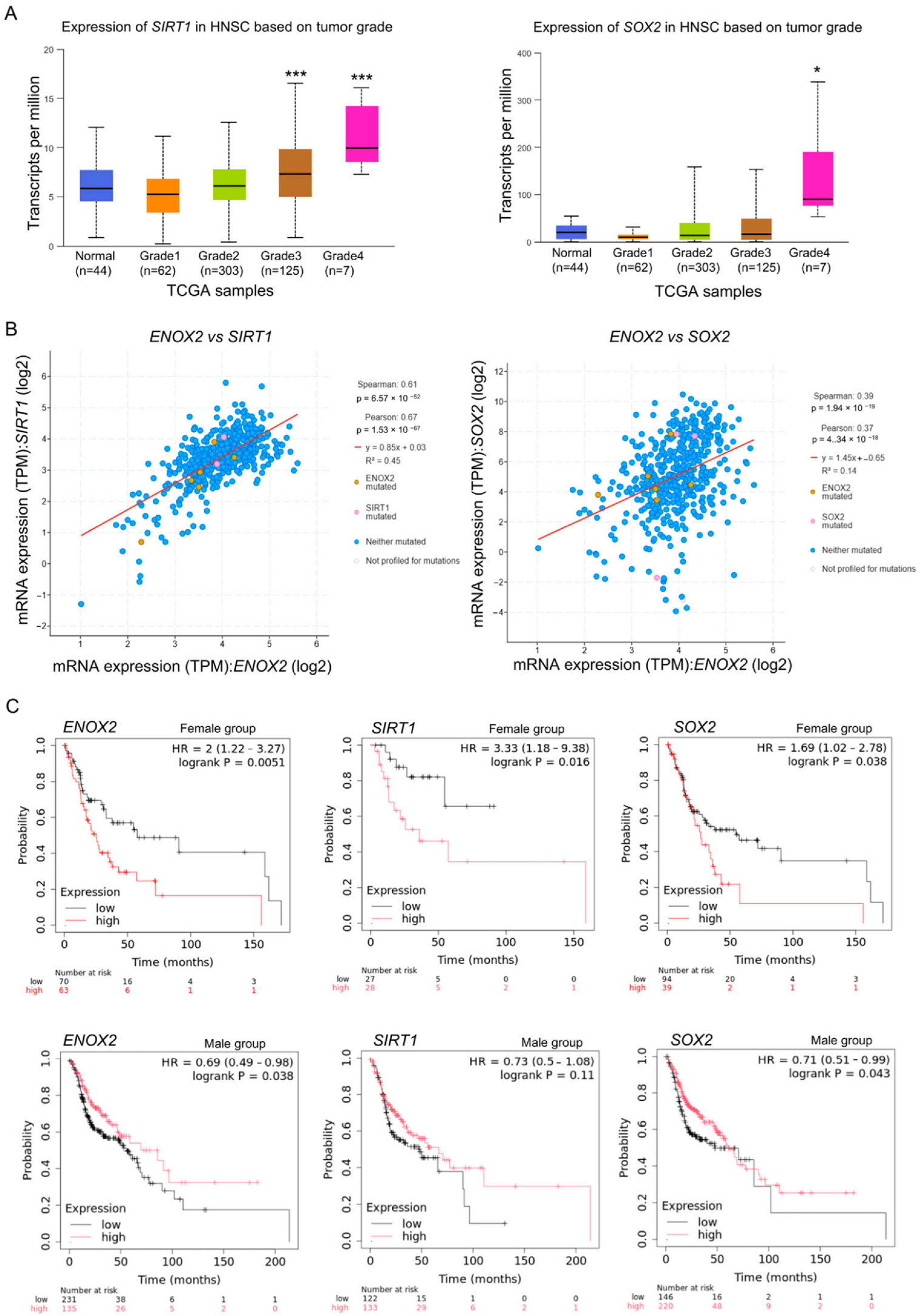 3.1. Expression Levels of ENOX2, SIRT1, and SOX2 Are Upregulated in Patients with Oral Cancer