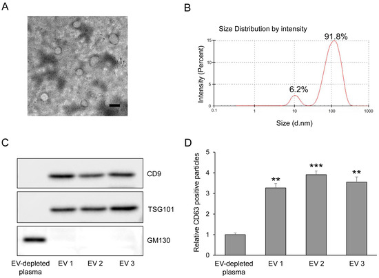 Characterization of plasma-derived extracellular vesicles. (A) Transmission electron microscopy (TEM) images showing round, membrane-bound morphology of purified plasma EVs. Scale bar = 200 nm. (B) Dynamic Light Scattering (DLS) profile of plasma-derived EVs obtained using the Nano-ZS Zetasizer, illustrating the hydrodynamic size distribution of EV particles. (C) Western blot analysis of EV-enriched markers (TSG101 and CD9) and the Golgi marker GM130, confirming enrichment of EV proteins and minimal contamination from cellular organelles. (D) Quantification of CD63 expression in EV-depleted plasma and plasma-derived EV fractions using ELISA, confirming successful enrichment of CD63-positive EVs (n = 5). The values represent the mean ± SEM. ** p < 0.01 and *** p < 0.001 vs. control. EV, extracellular vesicle.
