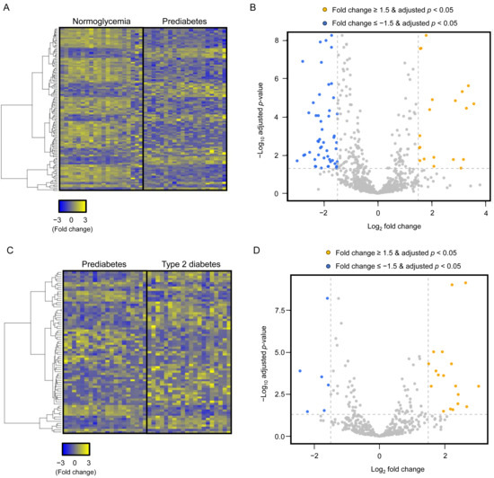Differential expression of plasma-derived EV miRNAs across glycemic groups. (A) Heatmap showing z-score–normalized expression patterns of plasma-derived EV miRNAs in subjects with normoglycemia and prediabetes. Yellow and blue indicate relative upregulation and downregulation, respectively. (B) Volcano plot illustrating differentially expressed EV miRNAs in prediabetes compared with normoglycemia. Statistical significance was determined using false discovery rate (FDR)–adjusted p-values. miRNAs with an absolute fold change > 2 and FDR < 0.05 are highlighted. (C) Heatmap showing z-score–normalized expression patterns of EV miRNAs in subjects with prediabetes and T2DM. (D) Volcano plot illustrating differentially expressed EV miRNAs in T2DM compared with prediabetes using FDR-adjusted p-values (|fold change| > 2, FDR < 0.05). EV, extracellular vesicle; miRNA, microRNA; T2DM, type 2 diabetes mellitus.