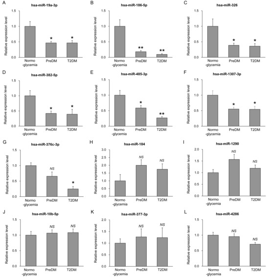 Validation of selected EV miRNAs in an independent cohort. Expression levels of plasma-derived EV miRNAs in subjects with normoglycemia (n = 50), prediabetes (n = 50), and T2DM (n = 50). Expression levels of miR-19a-3p (A), miR-186-5p (B), miR-326 (C), miR-382-5p (D), miR-485-3p (E), miR-1307-3p (F), miR-376c-3p (G), miR-184 (H), miR-1290 (I), miR-10b-5p (J), miR-377-3p (K), and miR-4286 (L) were determined by qRT-PCR analysis. Results are shown as mean ± SEM (n = 50). * p < 0.05 and ** p < 0.01 compared to normoglycemia; NS, not statistically significant.