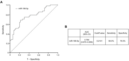 Receiver operating characteristic (ROC) curve analysis was additionally conducted to evaluate the discriminatory performance of plasma-derived EV miR-186-5p for prediabetes (Figure 4). The ROC analysis demonstrated that miR-186-5p exhibited good diagnostic performance (AUC 280 = 0.745, 95% CI, 0.578–0.912), with the area under the curve (AUC) indicating a meaningful ability to distinguish individuals with prediabetes from normoglycemic subjects. An optimal cutoff value was estimated using the Youden index as an exploratory reference; however, this threshold should be interpreted cautiously, as the present study was not designed to establish definitive diagnostic cutoffs, and further validation in larger prospective cohorts will be required.