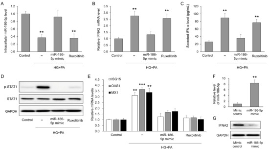 To determine whether the EV miRNAs altered in circulation also respond to diabetic stress within pancreatic β-cells, we examined intracellular levels of the six validated miRNAs in MIN6 cells exposed to high glucose and palmitate (HG+PA). Among these candidates, only miR-186-5p showed a significant reduction after HG+PA treatment compared with control cells (Supplementary Figure S2). Consistently, intracellular miR-186-5p levels were markedly decreased by HG+PA but were restored by transfection with a miR-186-5p mimic, whereas ruxolitinib, a JAK inhibitor, had no effect on miR-186-5p expression (Figure 5A). Successful overexpression of miR-186-5p following mimic transfection was directly confirmed by qRT-PCR analysis (Figure 5F). HG+PA treatment significantly increased IFNA2 mRNA expression, which was effectively suppressed by miR-186-5p mimic but not by ruxolitinib (Figure 5B). Consistent with these mRNA changes, IFNA2 protein expression was also markedly reduced following miR-186-5p mimic transfection (Figure 5G). Secreted IFN-α levels in the culture supernatant closely mirrored the intracellular IFNA2 expression pattern (Figure 5C). Activation of downstream signaling was evidenced by enhanced STAT1 phosphorylation under HG+PA conditions, which was normalized by either miR-186-5p mimic or ruxolitinib (Figure 5D). Furthermore, the expression of interferon-stimulated genes (ISG15, OAS1, and MX1) exhibited a similar pattern, showing induction by HG+PA and suppression by both miR-186-5p mimic and ruxolitinib (Figure 5E).