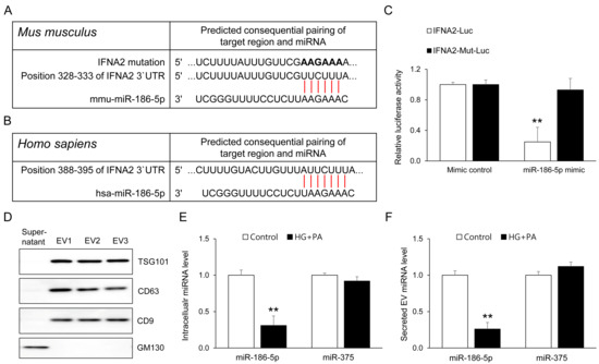 To identify direct downstream targets of miR-186-5p relevant to β-cell stress responses, we performed in silico target prediction using TargetScan. This analysis identified IFNA2 as a conserved putative target of miR-186-5p in both mice and humans, with a predicted binding site located within the 3′ untranslated region (3′UTR) (Figure 7A,B). To experimentally validate this interaction, we measured luciferase activity in HEK293 cells co-transfected with a miR-186-5p mimic and a luciferase reporter containing the wild-type IFNA2 3′UTR. Introducing the miR-186-5p mimic led to a marked reduction in reporter activity, whereas altering the seed-binding region completely eliminated this effect (Figure 7C). These results demonstrate that miR-186-5p directly interacts with the IFNA2 3′UTR. We next examined whether β-cells themselves contribute to the reduction in circulating EV miR-186-5p observed in prediabetes. EVs were isolated from MIN6 cell supernatants, and EV identity was confirmed using established markers (Figure 7D). HG+PA treatment markedly decreased miR-186-5p expression in both intracellular and EV fractions, whereas the abundance of the β-cell–enriched miRNA miR-375 remained unchanged (Figure 7E,F). These findings suggest that β-cells may represent one biologically relevant contributor to the reduction in circulating EV miR-186-5p during prediabetes. Thus, EV miR-186-5p released from stressed β-cells mirrors intracellular miR-186-5p depletion and may partially explain the lowered plasma EV miR-186-5p levels observed in individuals with prediabetes.