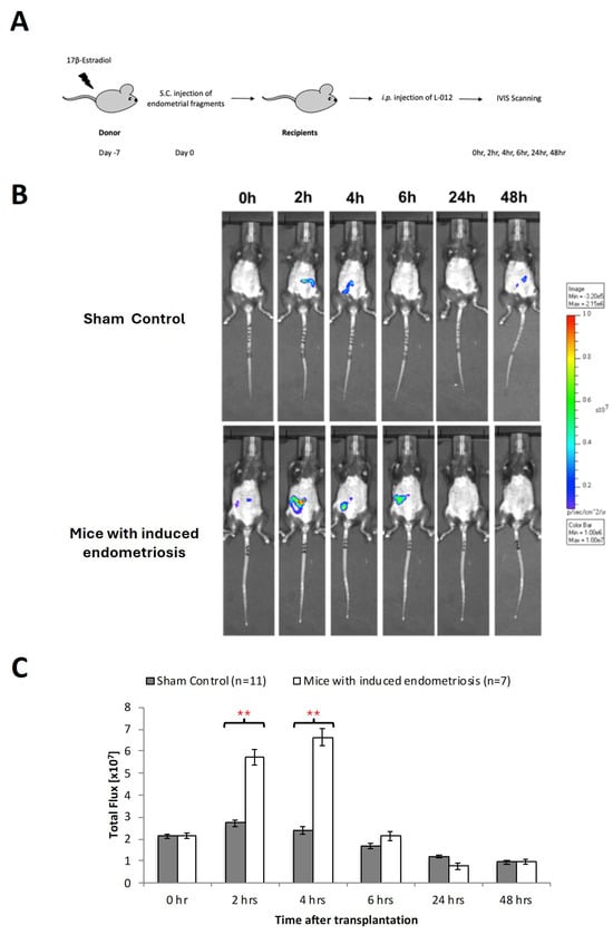 Using an imaging detection system, in vivo imaging of ROS formation was quantified at different timepoints after implantation of endometrial fragments followed by intravenous administration of L-012 (Figure 2A). Although we occasionally detected non-specific low-intensity signals in the sham-operated animals, these signals were mainly located in non-implanted areas (Figure 2B,C). In contrast, mice with endometriotic lesions showed strong ROS signals in the time interval between 2 and 4 h after implantation, and there were significant (p < 0.01) differences in the sham-operated individuals (Figure 2B,C). At later timepoints, the ROS signals began to decrease and reached initial values after 6 h (Figure 2C).