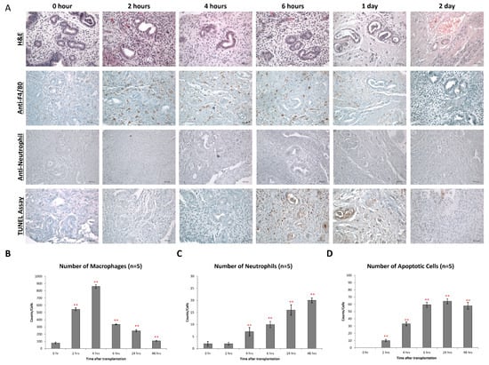 Macrophage infiltration during early endometriosis development. (A) Endometrial lesions were characterized by immunohistochemistry for the expression of F4/80 and neutrophil and presence of apoptosis. (B) Counts of F4/80+ cells (macrophages) in the endometrial tissue after transplantation at different time points. (C) Counts of neutrophils in the endometrial tissue after transplantation at different time points. (D) Counts of apoptotic cells in the endometrial tissue after transplantation at different time points. Significantly different from baseline, ** p < 0.01.