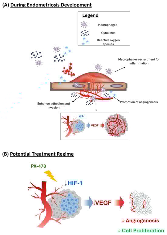 Schematic diagram on the formation of endometriosis. (A) Early growth and vascular development of endometriosis. (B) Proposed mechanism on PX-478 on preventing early endometriosis formation.