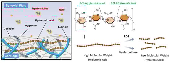 Furthermore, the overproduction of reactive oxygen species (ROS) plays a very crucial role in the progression of joint degeneration [8]. ROS, including hydrogen peroxide (H2O2), hydroxy radical (OH−), and superoxide anion (O2−) are generated by activated chondrocytes and synoviocytes in response to mechanical stress and inflammatory cytokines [9]. These reactive molecules can directly damage joint tissues by inducing oxidative stress, leading to degradation of extracellular matrix components such as collagen and proteoglycans [10]. Importantly, ROS also contribute to the depolymerization and degradation of HA in the synovial fluid, reducing its molecular weight and impairing its viscoelastic and lubricating properties (Figure 1) [11,12]. This loss of HA function exacerbates joint inflammation and cartilage breakdown, further accelerating OA progression. Therefore, protecting HA from degradation is essential for maintaining joint homeostasis and managing OA symptoms.