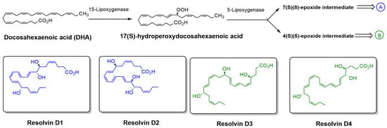 Biosynthetic pathway of RvDs derived from DHA. DHA is enzymatically converted by 15-LOX to 17(S)-hydroperoxydocosahexaenoic acid, which is then further metabolized by 5-LOX to form either a 7(S),(8)-epoxide intermediate (pathway A) or a 4(S),(5)-epoxide intermediate (pathway B). These intermediates lead to the formation of specific RvDs, including Resolvin D1 and D2 (pathway A) and Resolvin D3 and D4 (pathway B). The chemical structures of Resolvin D1–D4 are also shown.