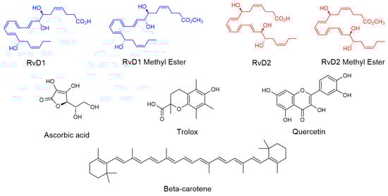Chemical structure of RvD1, RvD2, and their methyl ester and all controls including Trolox, Ascorbic acid, β-Carotene, and Quercetin.