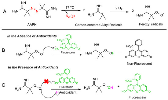 ORAC assay mechanism: (A) Thermal breakdown of AAPH in the presence of oxygen forms alkoxy radicals (ROS). (B) Without antioxidants, the peroxyl radicals degrade fluorescein, reducing its fluorescence. (C) Antioxidants neutralize ROS and preserve fluorescein’s fluorescence.