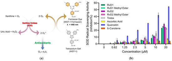 Principle and evaluation of SOD assay kit. (a) Schematic representation of the SOD assay principle. Superoxide anions (O2−•) are generated by the enzymatic reaction of xanthine and oxygen in the presence of xanthine oxidase (XOD). These radicals reduce the tetrazolium salt WST-1 to a water-soluble formazan dye (λ = 440 nm). Antioxidants inhibit this reduction by scavenging superoxide radicals, leading to reduced absorbance. (b) SOD radical scavenging activity (% inhibition) of various compounds, including RvD1, RvD1 methyl ester, RvD2, RvD2 methyl ester, Trolox, Ascorbic acid, Quercetin, and β-Carotene at different concentrations (0.62–20 µM). Data are presented as mean ± SD (n = 3).