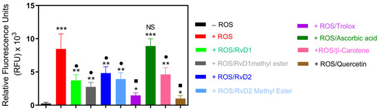 ROS induced by a CuCl2/H2O2 system were treated with RvD1, RvD2, their methyl esters, and known antioxidant standards (Trolox, Ascorbic acid, β-Carotene, and Quercetin). The intensity of ROS generation was quantified spectrophotometrically and expressed as a percentage relative to the ROS control group. All tested compounds reduced ROS formation except Ascorbic acid. Data are presented as mean ± SD (n = 3). * p < 0.05, ** p < 0.01, *** p < 0.001 (vs. CTL); • p < 0.05, ▪ p < 0.01, (vs. ROS), NS (not significant).