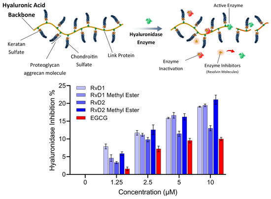Hyaluronidase inhibitory activity was assessed using a modified Morgan–Elson method [37]. Stock solutions of RvD1, RvD2, and their methyl-ester derivatives in ethanol were evaporated to dryness under a gentle stream of nitrogen at room temperature to remove solvent. The dried residues were reconstituted in 0.1 M acetate buffer (pH 3.6) and serially diluted to the final test concentrations (1.25–10 µM) immediately prior to the assay; samples were protected from light and handled quickly to minimize oxidation. The assay was performed using a 1 mg/mL HAase stock (≥300 Units/mL) prepared in 0.1 M acetate buffer (pH 3.6). For each test, 25 µL of sample was combined with 10 µL of the HAase stock and incubated at 37 °C for 20 min. Next, 20 µL of 12.5 mM CaCl2 was added to activate the enzyme and incubation continued at 37 °C for another 20 min. Subsequently, 25 µL of 3.5 mg/mL HA (in the same acetate buffer) was introduced and the mixture was incubated at 37 °C for 40 min. Reactions were terminated by adding 20 µL of 0.4 N NaOH followed by 20 µL of 0.4 N potassium tetraborate, and the tubes were heated at 100 °C for 3 min. After cooling to room temperature, 160 µL of 4-(dimethylamino) benzaldehyde reagent (final concentration 0.335 M) was added. Samples were incubated at 37 °C for 10 min and absorbance was measured at 585 nm. EGCG was used as a positive control. The HAase inhibition activity of samples was determined using the following equations: