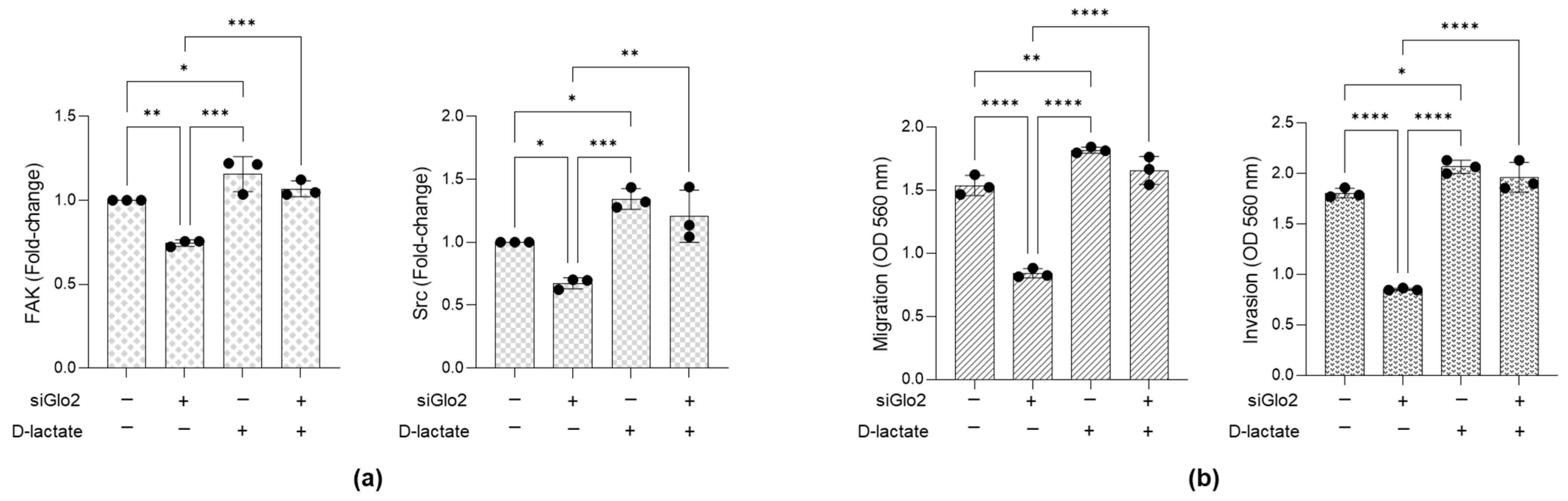 3.4. Glo2-Derived D-Lactate Activates FAK/Src Signaling and Promotes EMT-Associated Phenotypic Changes, Enhancing Migratory and Invasive Behavior in PC3 Cells
