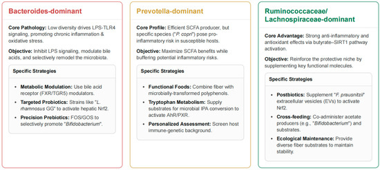 Different microbial community configurations exhibit distinct metabolic capabilities that directly influence treatment responses (Figure 2). When provided with identical fiber substrates, Prevotella-enriched communities generate significantly higher total SCFA concentrations—particularly propionate—compared with Bacteroides-dominant communities [167]. These differences are associated with divergent therapeutic outcomes: high-fiber dietary interventions yield superior metabolic benefits in individuals with Prevotella-enriched configurations, whereas those with Bacteroides-dominant profiles may respond more favorably to strategies that selectively increase Bifidobacterium populations [168,169]. Such differential responses reflect the baseline metabolic capacities and inflammatory profiles associated with different community types.
