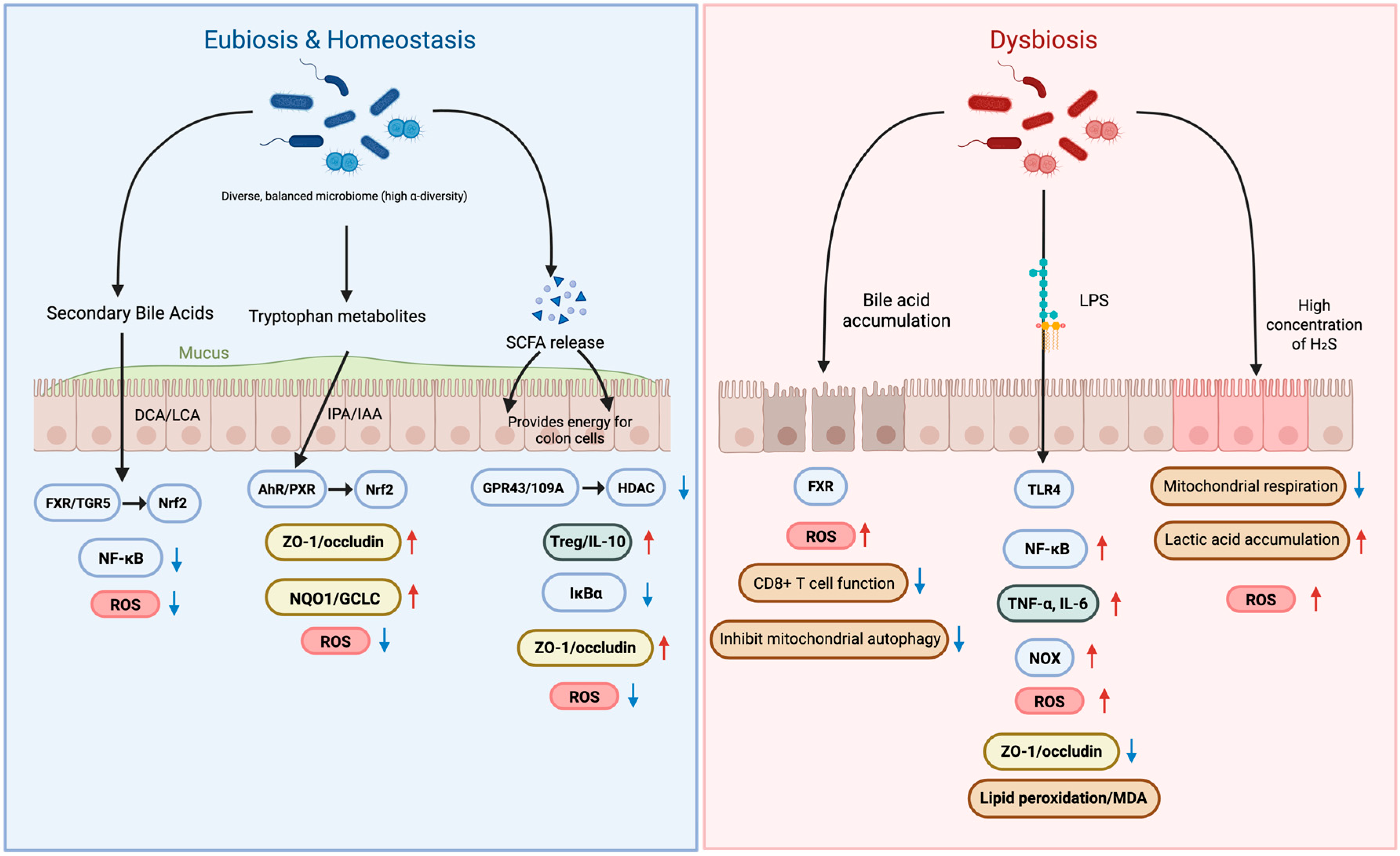 This figure illustrates how gut microbial metabolites regulate oxidative stress and intestinal barrier integrity by contrasting eubiosis and dysbiosis. In eubiosis, a diverse microbiome produces beneficial metabolites like secondary bile acids, tryptophan metabolites, and SCFAs. These compounds activate signaling pathways such as FXR and AhR that enhance tight junctions (ZO-1/occludin) and reduce oxidative stress by downregulating ROS. This maintains a strong, healthy intestinal barrier. In contrast, dysbiosis—an imbalanced microbiome—is characterized by the accumulation of harmful substances like LPS, which activate inflammatory pathways such as TLR4 and NF-κB. This leads to increased oxidative stress, breakdown of the intestinal barrier, and heightened inflammation (TNF-α, IL-6), ultimately contributing to conditions like “leaky gut” and cellular damage. SCFAs, short-chain fatty acids; DCA, deoxycholic acid; LCA, lithocholic acid; IPA, indole-3-propionic acid; IAA, indole-3-acetic acid; ROS, reactive oxygen species; FXR, farnesoid X receptor; TGR5 (GPBAR1), G-protein-coupled bile acid receptor 1; AhR, aryl hydrocarbon receptor; PXR, pregnane X receptor; HDAC, histone deacetylase; SIRT1, sirtuin 1; IκBα, inhibitor of NF-κB; TLR4, toll-like receptor 4; NOX, NADPH oxidase; MDA, malondialdehyde; ZO-1, tight junction protein-1, TNF-α, tumor necrosis factor alpha; IL-6, interleukin-6.