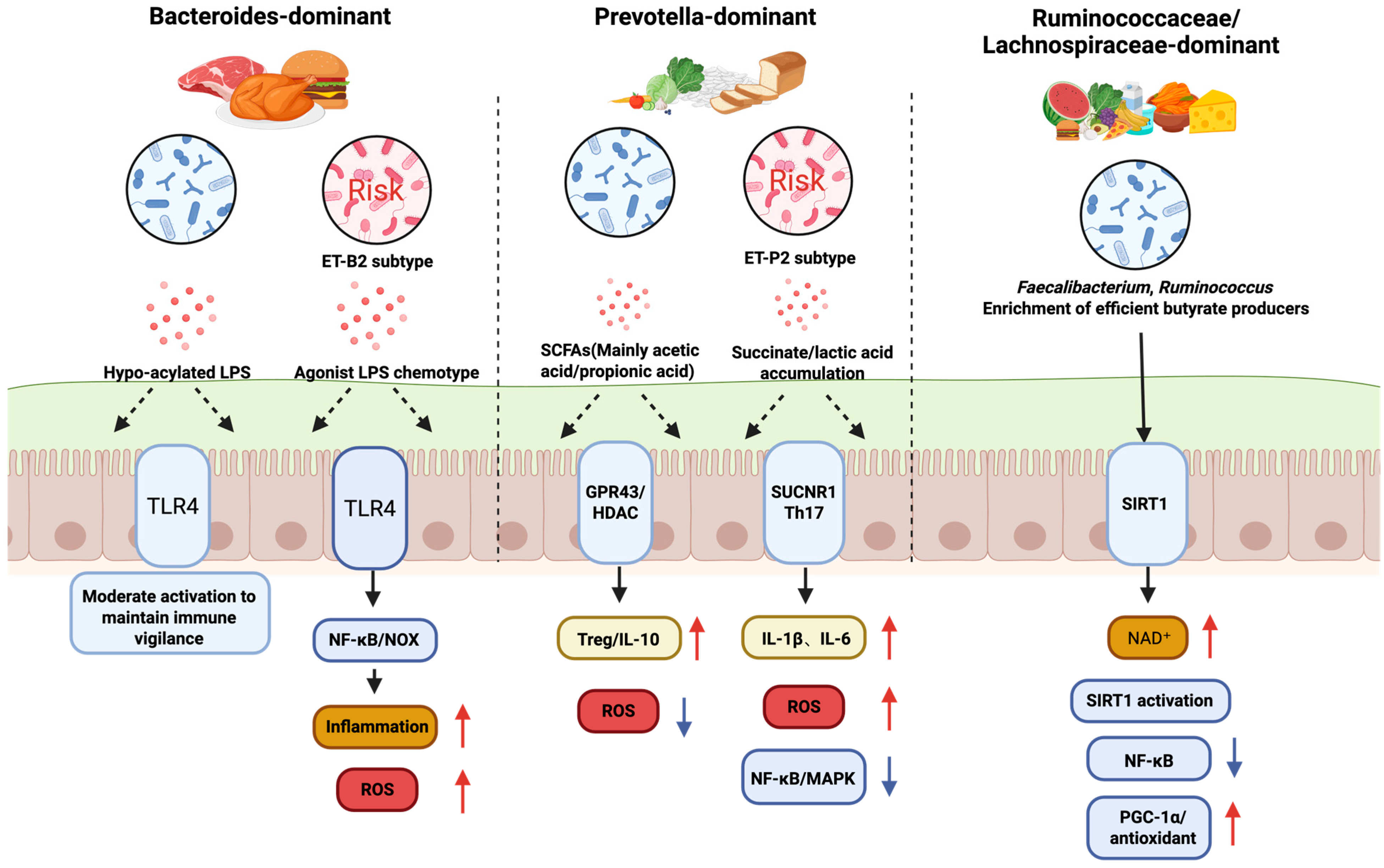 This figure illustrates how different gut microbial community configurations, defined by their dominant bacterial species and influenced by diet, distinctly regulate intestinal health, particularly in relation to oxidative stress and immune responses. The Bacteroides-dominant community, often associated with a high-protein diet, can produce hypo-acylated LPS or agonist LPS. These activate the TLR4 pathway, leading to moderate immune activation and maintaining immune vigilance, but can also contribute to inflammation and increased ROS. The Prevotella-dominant community, linked to a high-carbohydrate diet, produces large amounts of SCFAs and succinate/lactic acid. While SCFAs activate GPR43 to promote anti-inflammatory responses (Treg/IL-10), succinate can stimulate the SUCNR1 pathway, leading to increased ROS and inflammation (IL-1β, IL-6, NF-κB/MAPK). Lastly, the Ruminococcus/Lachnospira-enriched community is characterized by efficient butyrate producers like Faecalibacterium and Ruminococcus. Butyrate provides energy for the host and activates the SIRT1 pathway via NAD+, which downregulates inflammatory responses (NF-κB) and upregulates antioxidant pathways (PGC-1α), promoting a healthy, low-stress state, free fatty acid receptor 2/3; SUCNR1, succinate receptor 1; Th17, T helper 17 cells; MAPK, mitogen-activated protein kinase; PGC-1α, peroxisome proliferator-activated receptor-γ coactivator-1α; NAD+, nicotinamide adenine dinucleotide, oxidized form; IL-1β, interleukin-1 beta, NF-κB, Nuclear Factor kappa-light-chain-enhancer of activated B cell, MAPK, mitogen-activated protein kinase.