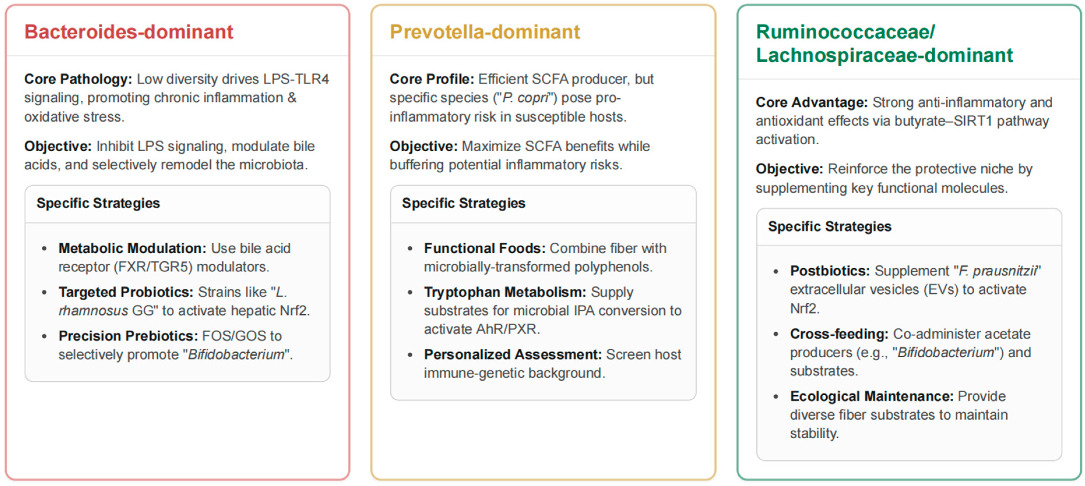 Importantly, microbial communities are better understood as compositional gradients rather than fixed categories, with most individuals occupying intermediate states. This implies that future microbiome-based interventions should consider continuous baseline characteristics—such as functional gene content, metabolic pathway enrichment, quantitative taxonomic ratios such as P/B ratio, or relative abundances of key functional guilds—rather than rely solely on discrete categorical labels. Compared with pharmacological therapies that directly target downstream inflammatory or metabolic pathways, microbiota-informed interventions remain largely conceptual and should currently be regarded as adjuncts rather than replacements for established treatments. Overall, microbiome- and redox-targeted strategies show encouraging preclinical and early clinical effects, but the translational gap to widespread clinical application remains substantial. Well-powered, rigorously controlled randomized trials with standardized redox and clinical endpoints will be essential before these approaches can be incorporated into routine clinical practice.