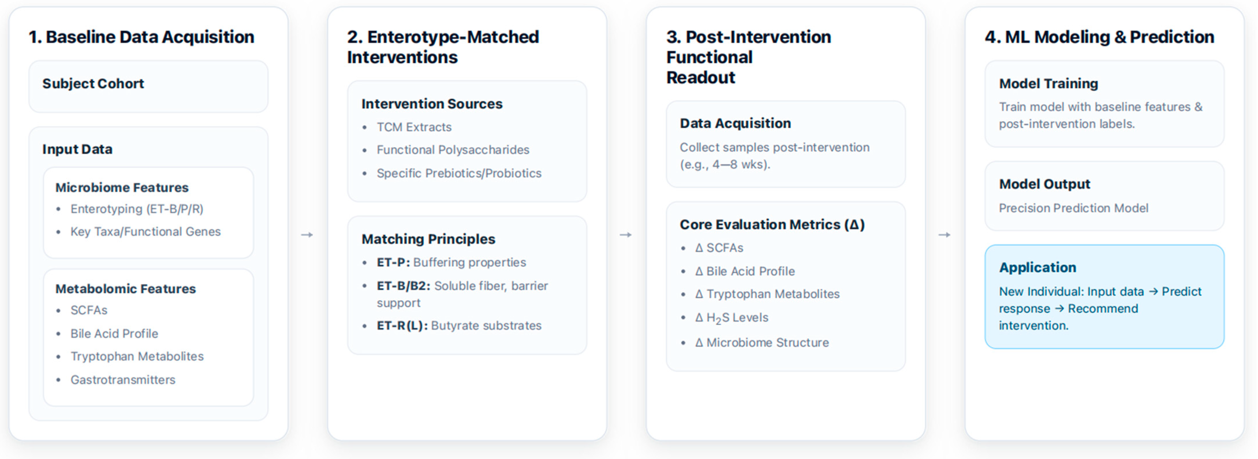 Community-based stratification has also shown promise in optimizing fecal microbiota transplantation (FMT). He et al. categorized FMT recipients as Enterobacteriaceae-dominant (RCPT/E) or Bacteroides-dominant (RCPT/B), revealing markedly different post-transplant engraftment patterns and clinical responses [172]. They further developed a colonization-to-recipient (C2R) index to quantify donor engraftment efficiency and an enterotype-based donor selection (EDS) model to improve donor–recipient matching. This represents a promising step beyond empirical FMT protocols toward rationalized donor selection. However, current microbiota-stratified FMT studies are limited to small cohorts and short follow-up, and their generalizability remains uncertain.