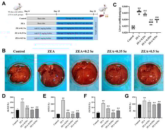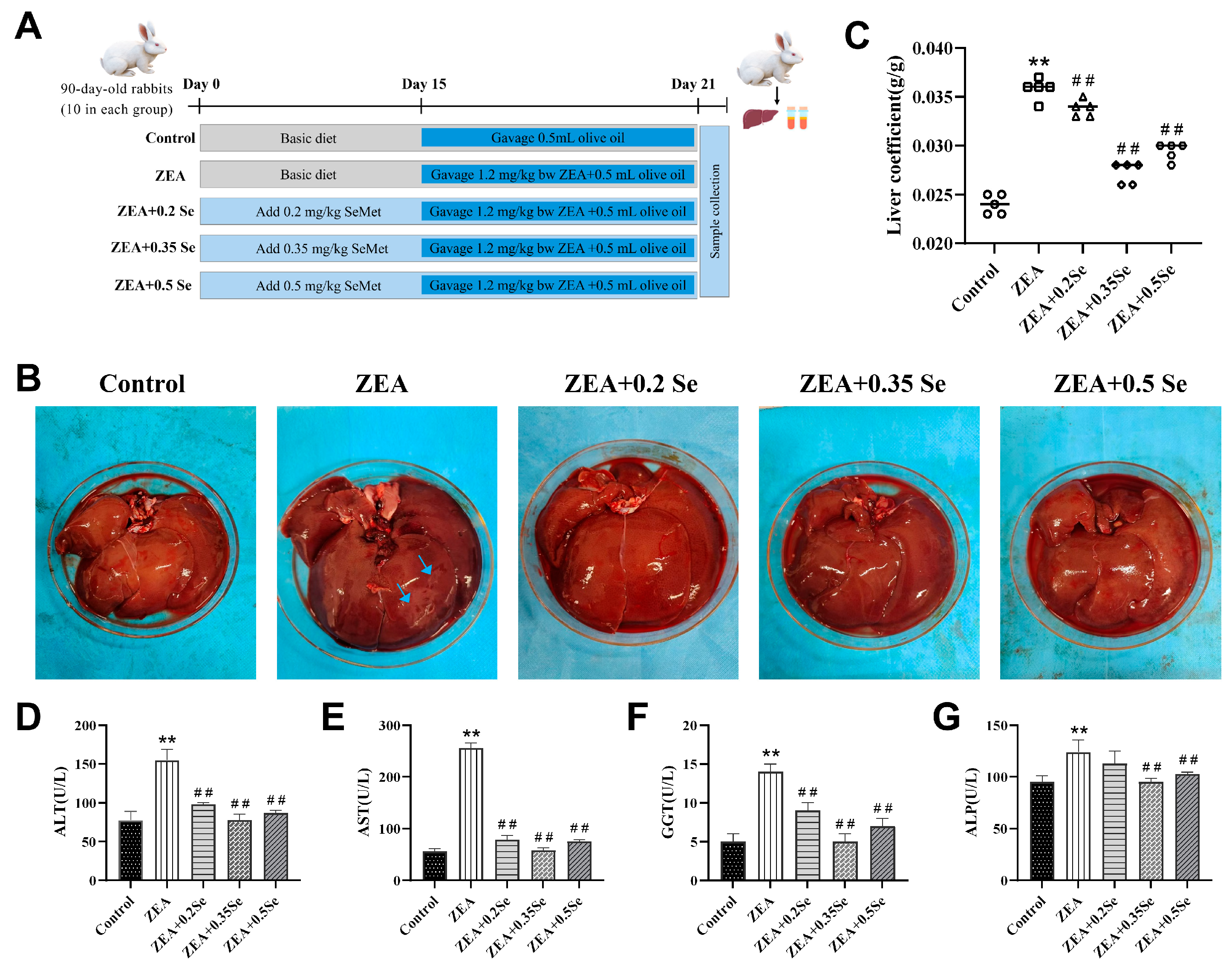 Figure 1. Liver morphology and function index of rabbits (n = 5). (A) Grouping of experimental animals. (B) Liver morphology (blue arrows: necrotic area). (C) Hepatic index. (DG) Serum ALT, AST, GGT, and ALP activities. Data are expressed as mean ± SD. ** p < 0.01 vs. control group; ## p < 0.01 vs. ZEA group.