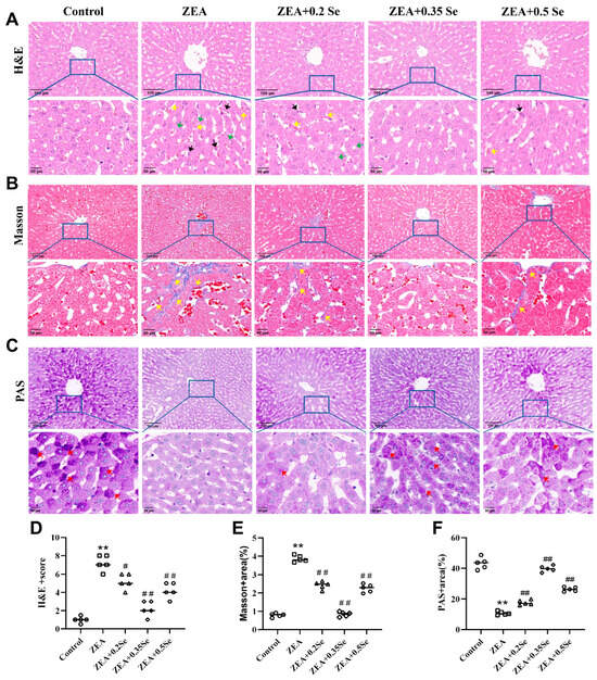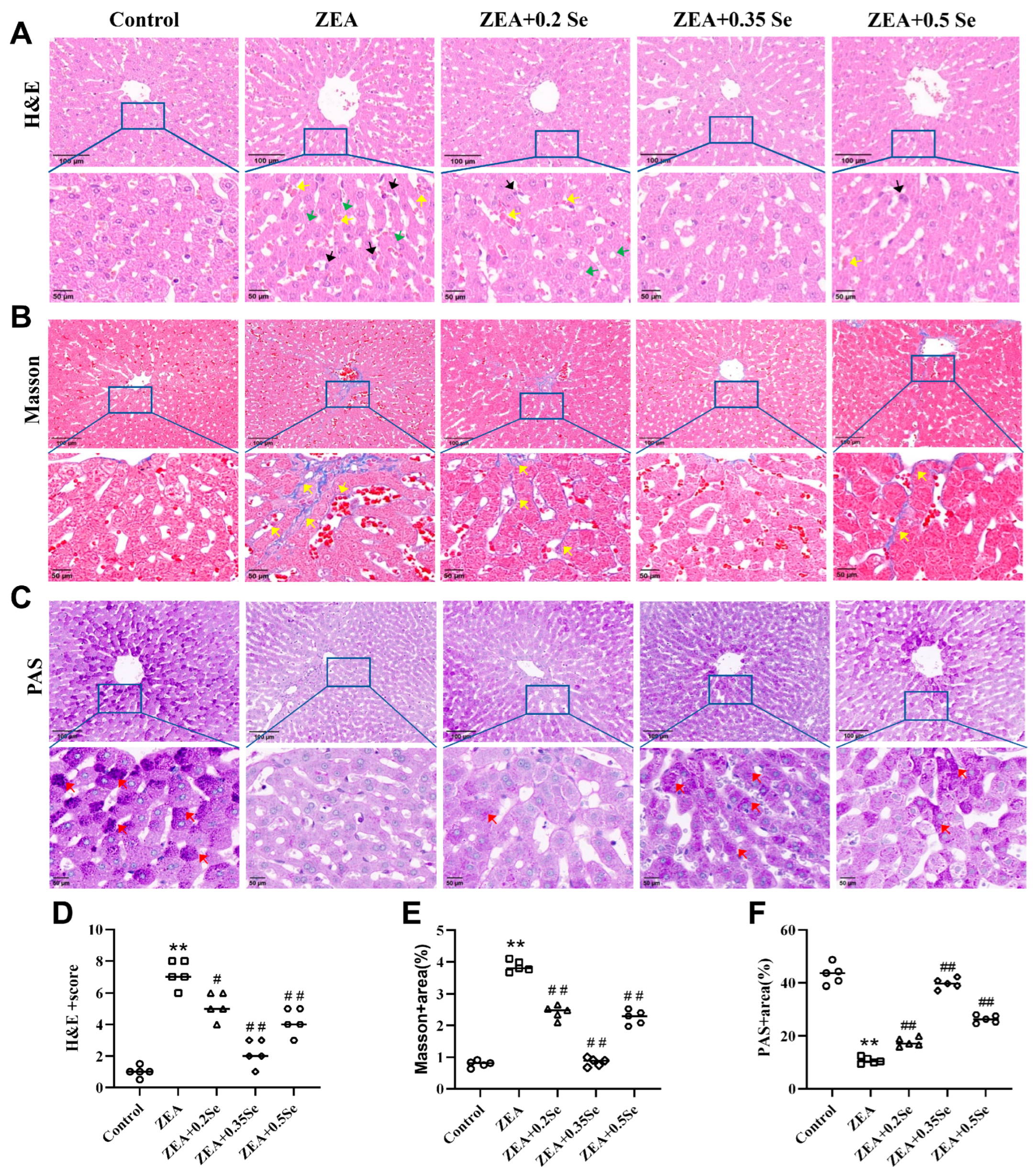 Figure 2. Histological changes in rabbit liver tissue (n = 5). (A) H&E staining showing inflammatory cell infiltration (black arrow), steatosis (green arrow), and sinusoidal congestion (yellow arrow). (B) Masson staining indicating collagen fiber deposition (yellow arrow). (C) PAS staining revealing purple–red glycogen granules (red arrow). The top row shows images at ×100 magnification (scale bar = 100 μm); the bottom row displays corresponding enlarged views at ×200 (scale bar = 50 μm). (D) HE stains score. (E,F) Positively stained areas in Masson and PAS staining. Data are expressed as mean ± SD. ** p < 0.01 vs. control group; # p < 0.05, ## p < 0.01 vs. ZEA group.