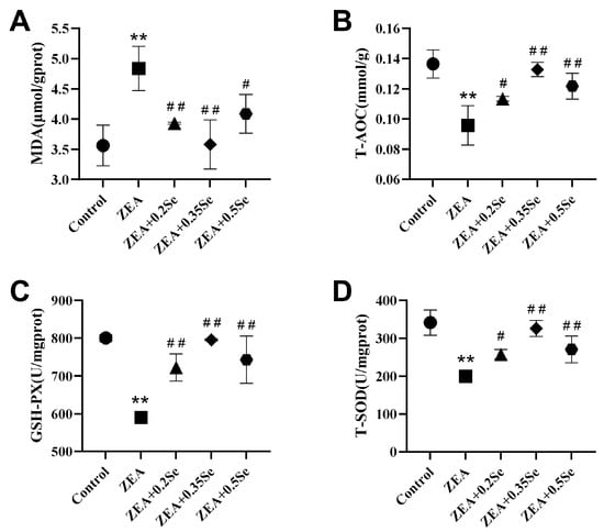 Figure 3. Oxidative stress parameters in rabbit liver (n = 5). (A) MDA content. (B) T-AOC level. (C) GSH-Px activity. (D) T-SOD activity. Data are expressed as mean ± SD. ** p < 0.01 vs. control group; # p < 0.05, ## p < 0.01 vs. ZEA group.