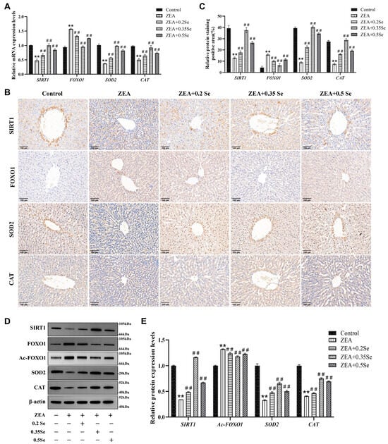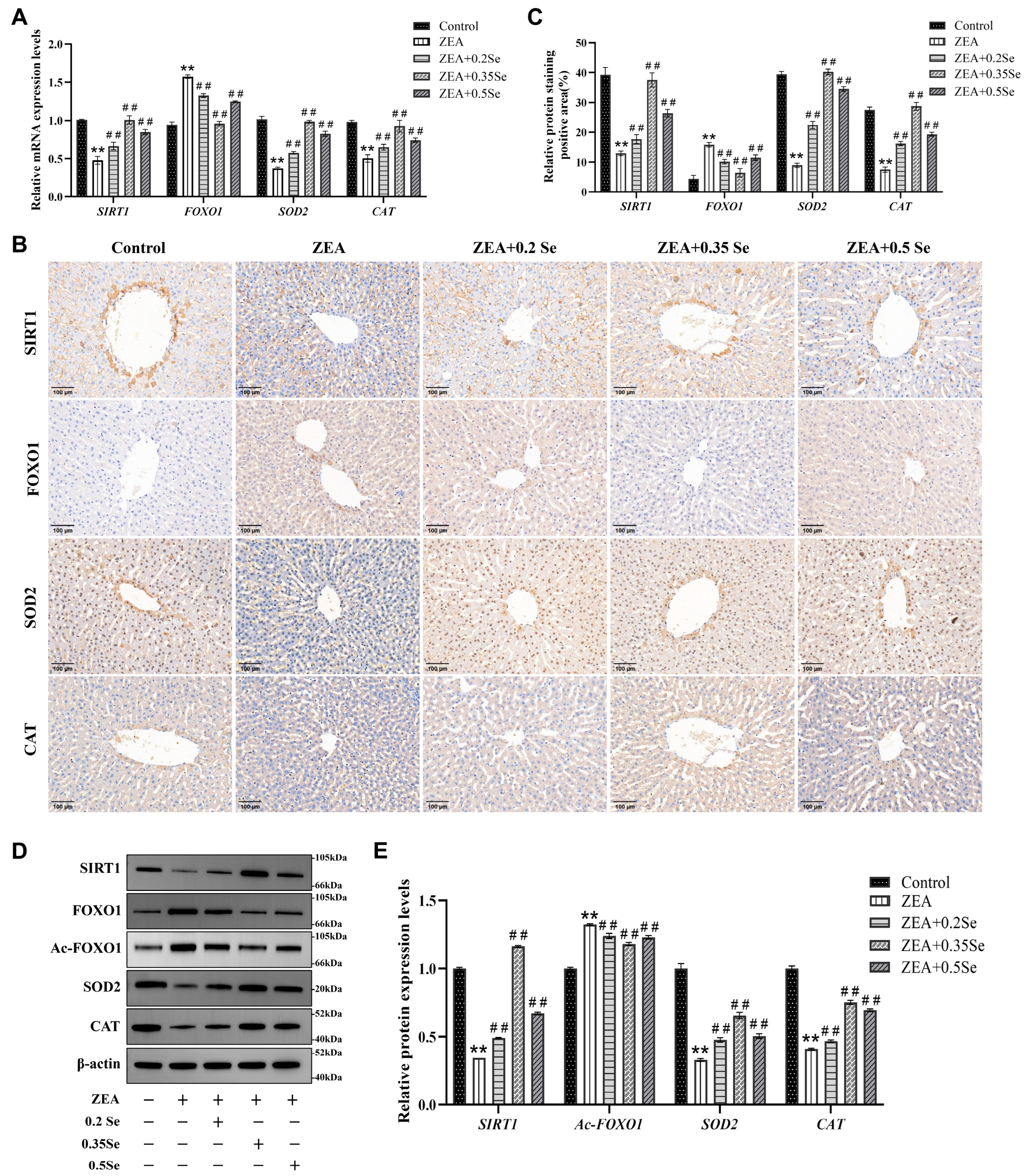 Figure 4. Expression of SIRT1-FOXO1 pathway components in rabbit liver tissue (n = 5). (A) mRNA levels of SIRT1, FOXO1, SOD2, and CAT determined by RT-qPCR. (B) Representative immunohistochemical image (×100 magnification; scale bar = 100 μm). (C) Semiquantitative analysis of immunohistochemical analysis. (D) Western blot bands of proteins. (E) Quantitative analysis of protein expression. Data are expressed as mean ± SD. ** p < 0.01 vs. control group; ## p < 0.01 vs. ZEA group.