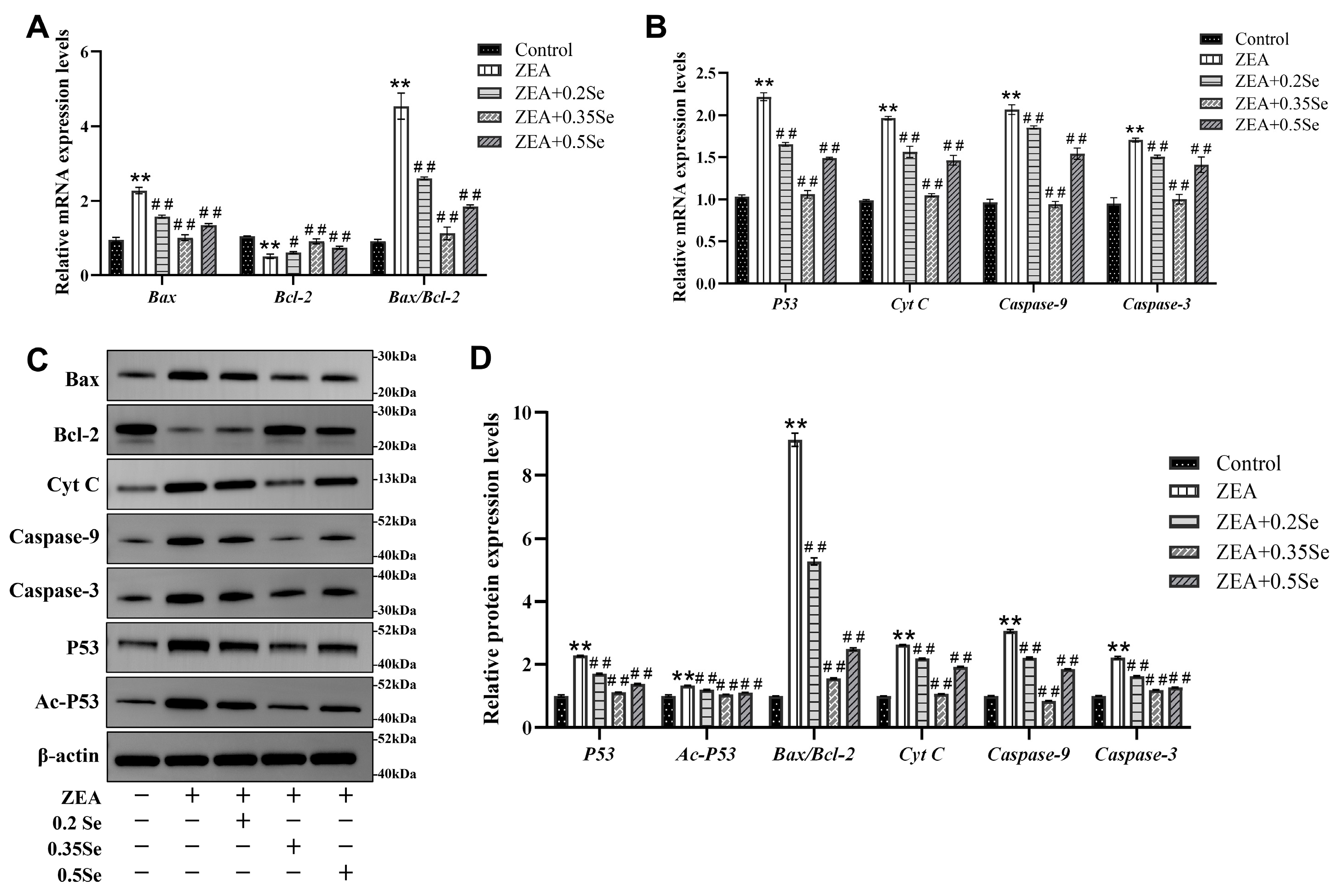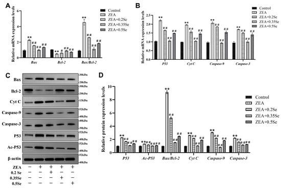 Figure 5. Expression of apoptosis-related genes and proteins in rabbit liver cells (n = 5). (A,B) mRNA levels of Bax, Bcl-2, Cyt C, Caspase-9, Caspase-3, and P53 by RT-qPCR analysis. (C) Western blotting band of proteins. (D) Quantitative analysis of protein expression, including the Bax/Bcl-2 ratio. Data are expressed as mean ± SD. ** p < 0.01 vs. control group; # p < 0.05, ## p < 0.01 vs. ZEA group.