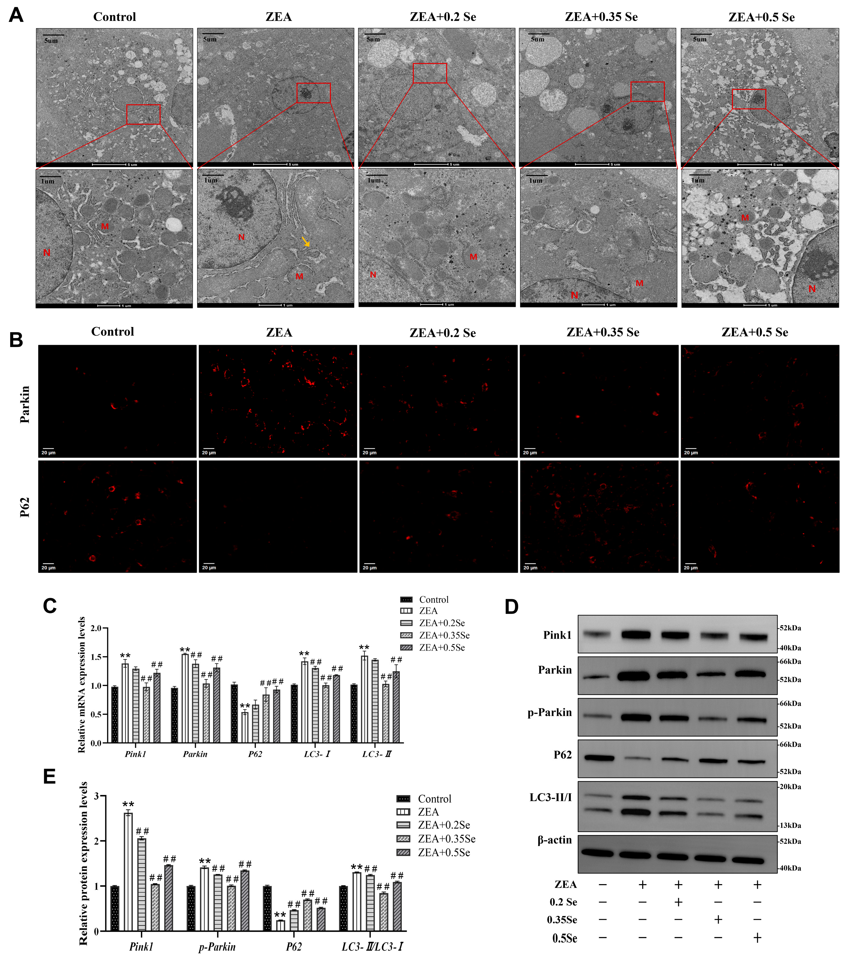 Figure 6. Changes in mitochondrial ultrastructure and mitophagy markers in rabbit hepatocytes (n = 5). (A) TEM images of mitochondrial ultrastructure. M: Mitochondria; N: Nucleus; Yellow arrow: Autophagosome. (B) Immunofluorescence localization of Parkin and P62 (Cy3-labeled). (C) mRNA expression levels of Pink1, Parkin, P62, LC3-I, and LC3-II measured by RT-qPCR. (D) Western blot bands of Pink1, Parkin, p-Parkin, P62, and LC3-II/LC3-I. (E) Quantitative analysis of mitophagy-related protein expression. Data are expressed as mean ± SD. ** p < 0.01 vs. control group; ## p < 0.01 vs. ZEA group.