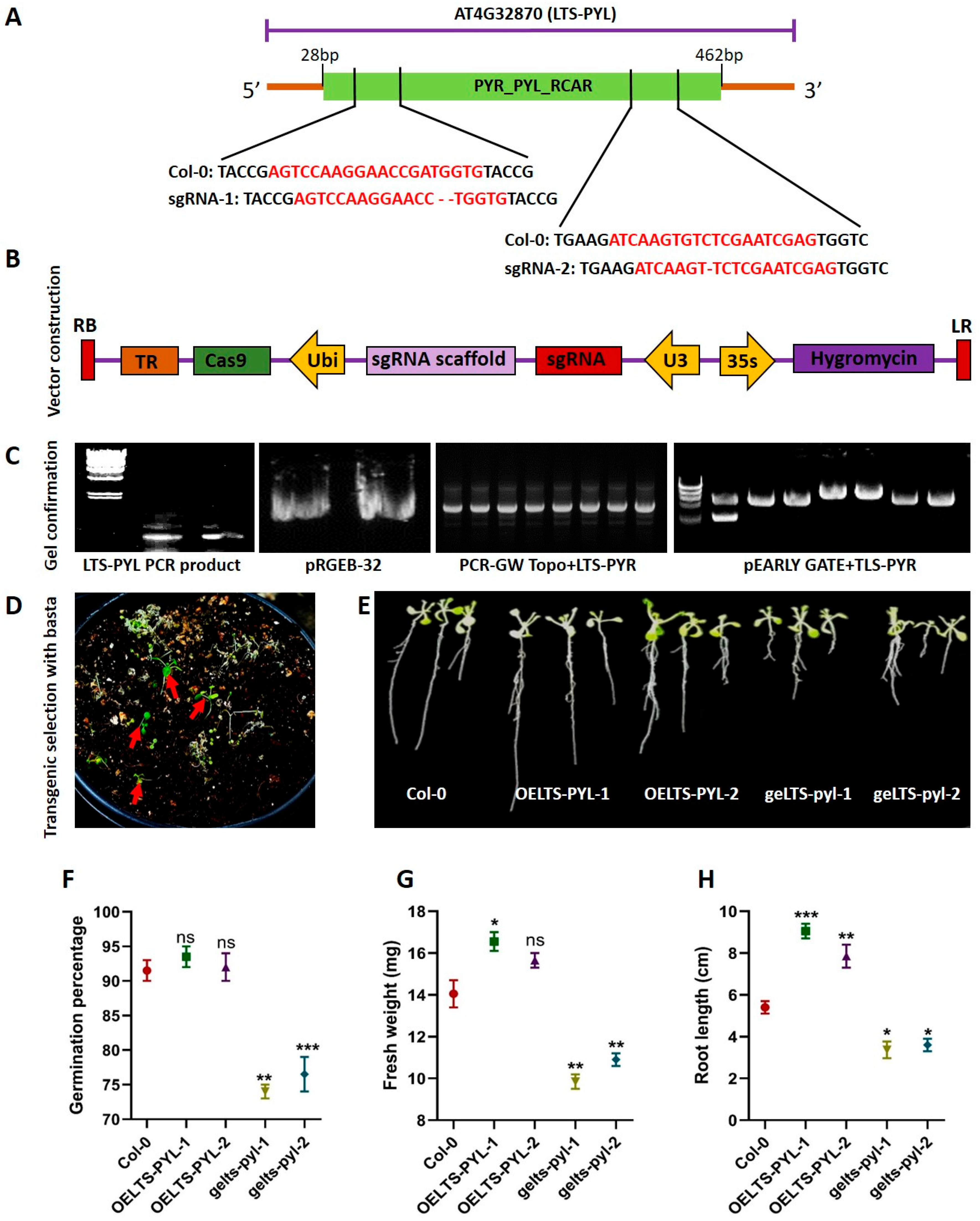 2.2. Generation of LTS-PYL-Edited Arabidopsis via CRISPR/Cas9