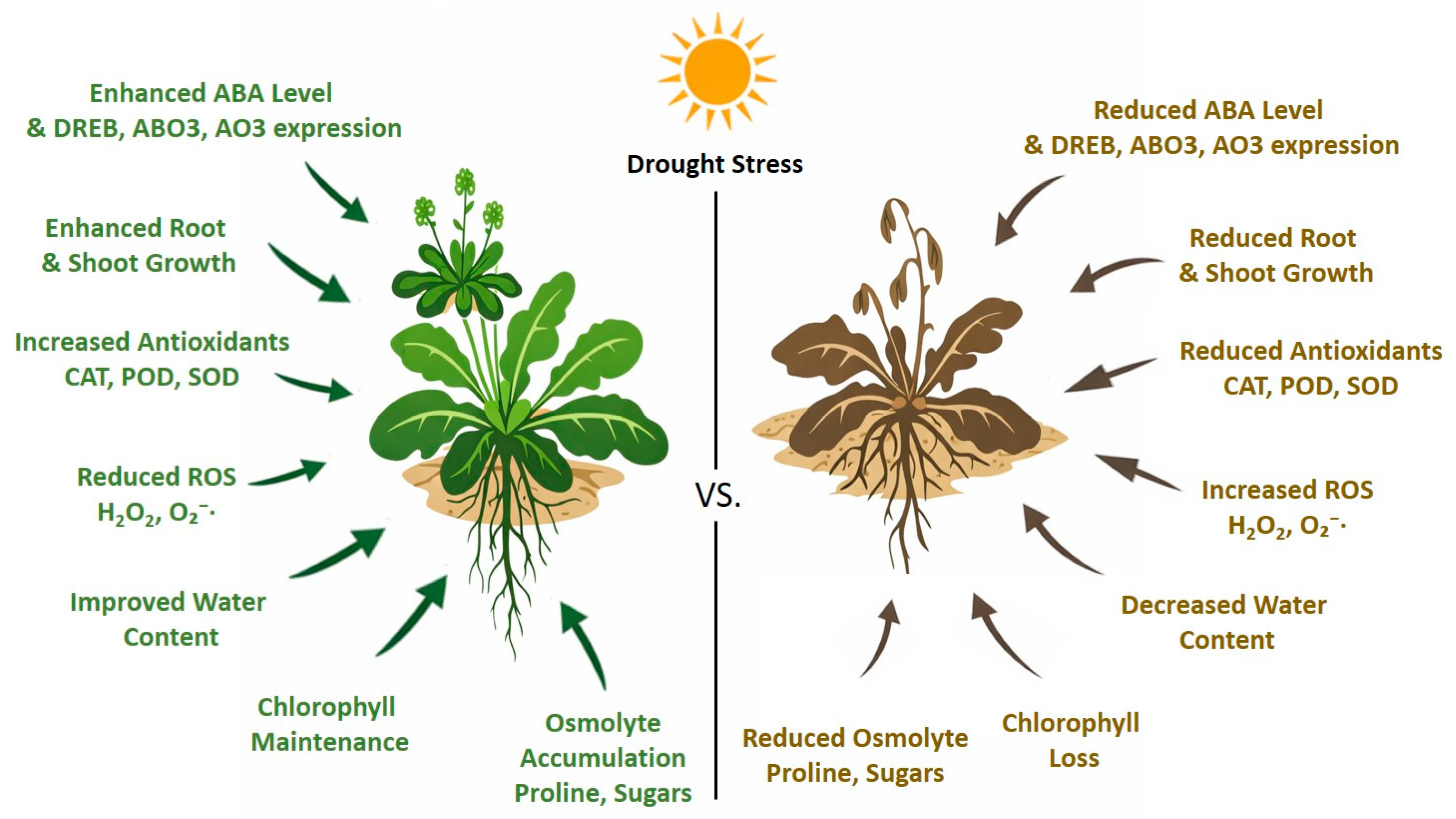 - Haghpanah, M.; Hashemipetroudi, S.; Arzani, A.; Araniti, F. Drought tolerance in plants: Physiological and molecular responses. Plants 2024, 13, 2962. [Google Scholar] [CrossRef]
