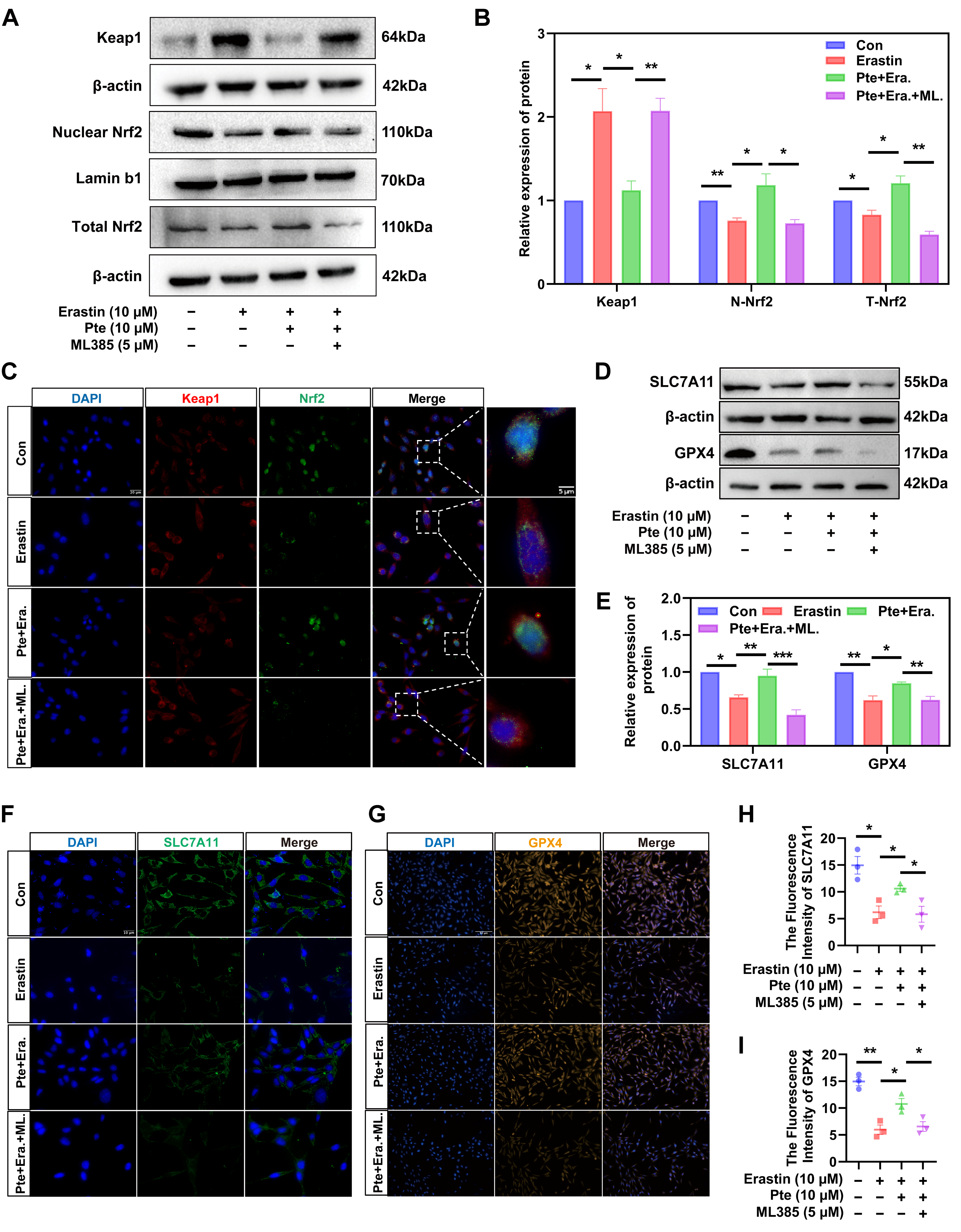 3.7. Pte Increases Nrf2 Nuclear Translocation by Promoting the Dissociation of Keap1 and Nrf2, Thereby Activating the Nrf2/SLC7A11/GPX4 Axis