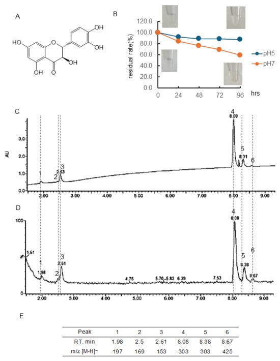 Stability of taxifolin (Tax) under different pH conditions. (A) Structural formula of Tax; (B) Tax residual rate and color change over time at pH 5 or 7. Data represent the average of three independent experiments; (C) chromatogram of Tax incubated at pH 7 for 96 h (detected photodiode array, PDA); (D) chromatogram of Tax incubated at pH 7 for 96 h (detected MS); (E) retention time of the peak and obtained in (D) and m/z [M-H]−.