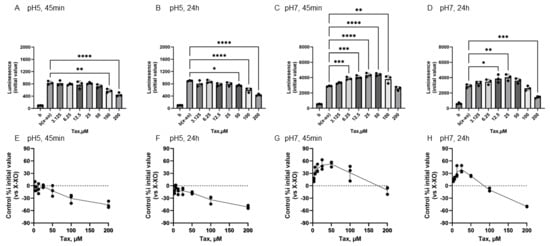 At pH 5, Tax addition caused a concentration-dependent decrease in the mean initial chemiluminescence at both 45 min and 24 h post-incubation (Figure 5A,B). The mean initial chemiluminescence was significantly reduced by Tax addition at concentrations of 100–200 µM after 45 min of incubation (Figure 5A) and significantly reduced compared to the control group at concentrations of 50–200 µM after 24 h of incubation (Figure 5B). The maximum reduction in initial luminescence was similar at 45 min and 24 h post-incubation, decreasing by approximately 50% at 200 µM (Figure 5E,F). At pH 7.0, luminescence increased in the low Tax concentration group after 45 min incubation, and these changes were also observed after 24 h incubation (Figure 5C,D). The mean initial chemiluminescence peaked at 50 µM after 45 min of incubation and increased from 6.25 µM to 100 µM (Figure 5G). After 24 h of incubation, similar enhancement was observed at 12.5 µM and 50 µM, while a decrease in luminescence was observed at 200 µM (Figure 5H). The increase in luminescence intensity after 45 min of incubation was dose-dependent, peaking at approximately 52.4% increase at 50 µM (Figure 5G). The increase in luminescence intensity after 24 h of incubation was also dose-dependent, showing approximately 39.2% increase at 25 µM. Conversely, a decrease of approximately 50.0% was observed at 200 µM (Figure 5H).