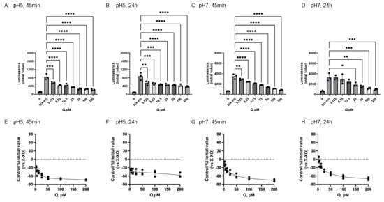 Redox properties of quercetin (Q) at 45 min or 24 h at different pH. The upper panel displays the average initial chemiluminescence at each concentration, while the lower panel shows the relative luminescence intensity compared to the control (without flavonoids). The two graphs on the left show the results after incubation at pH 5 for 45 min (A,E) or 24 h (B,F). The two graphs on the right show the results after incubation at pH 7 for 45 min (C,G) or 24 h (D,H). Data represents the mean ± SD of three independent experiments, * p < 0.05, ** p < 0.01, *** p < 0.001, **** p < 0.0001 compared to the positive control (X-XOD), after one-way ANOVA followed by Dunnett’s test.