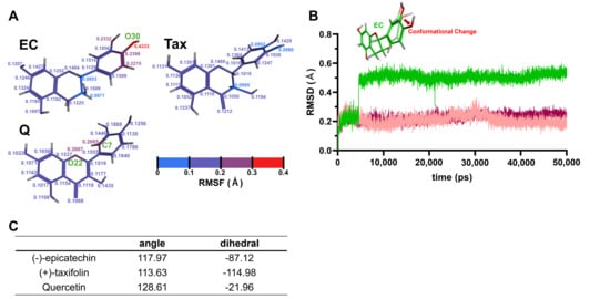 The results of the single molecular dynamics simulations for each flavonoid are shown in Figure 7. Figure 7A depicts RMSF values calculated from the atomic positions of each flavonoid saved during the 50,000 ps production run. Regions with larger atomic positional variations, i.e., greater molecular fluctuations, correspond to higher RMSF values. In Figure 7A, the color transitions from blue to red as the RMSF values increase. Notably, the RMSF values were highest in the B-ring of EC, with the oxygen atom at the 4′ position (O30) showing the greatest fluctuation (0.4333 Å). In the case of Tax, the RMSF values were generally lower. For Q, relatively big fluctuations were observed at the carbon atom at the 2′ position of the B-ring (C7) and the oxygen atom in the C-ring (O22), both showing almost the same RMSF values (0.2005 and 0.2007 Å, respectively). Figure 7B illustrates the time evolution of root-mean-square deviation (RMSD) values during the 50,000 ps production run. The 0 ps point represents the initial structure of the atoms after Number of particles, Volume, and Temperature (NVT) and Number of particles, Pressure, and Temperature (NPT) equilibrations. Larger RMSD values indicate greater structural deviations from this initial structure. Notably, the significant structural change in the B-ring of EC was observed between 4600 ps and 4610 ps. In contrast, the RMSD values for Tax and Q remained relatively stable throughout the production run. The atomic numbers of all atoms in EC, Tax, and Q, along with the detailed atomic parameters employed during the simulations and the corresponding RMSF values, are provided in Tables S1–S3.
