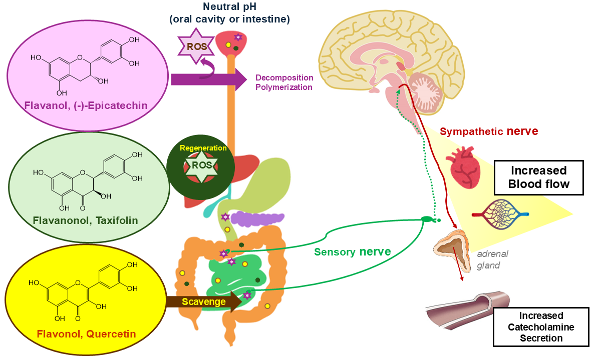 - Saito, A.; Inagawa, K.; Ebe, R.; Fukase, S.; Horikoshi, Y.; Shibata, M.; Osakabe, N. Onset of a hypotensive effect following ingestion of flavan 3-ols involved in the activation of adrenergic receptors. Free Radic. Biol. Med. 2016, 99, 584–592. [Google Scholar] [CrossRef]